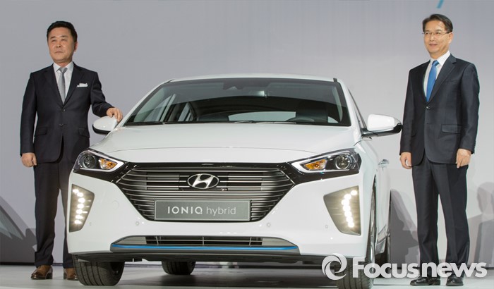 (서울=포커스뉴스) 14일 오전 서울 중구 동대문디자인플라자에서 권문식(오른쪽) 현대자동차 부회장과 곽진 부사장이 하이브리드 자동차 '아이오닉'을 선보이고 있다.