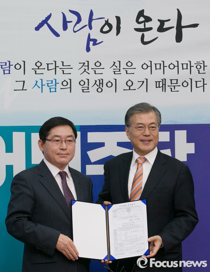 (서울=포커스뉴스) 문재인(오른쪽) 더불어민주당 대표가 14일 오전 서울 여의도 국회에서 열린 인재영입 기자회견에 참석해 박희승 전 수원지법 안양지원장과 입당원서를 들고 기념촬영을 하고 있다.