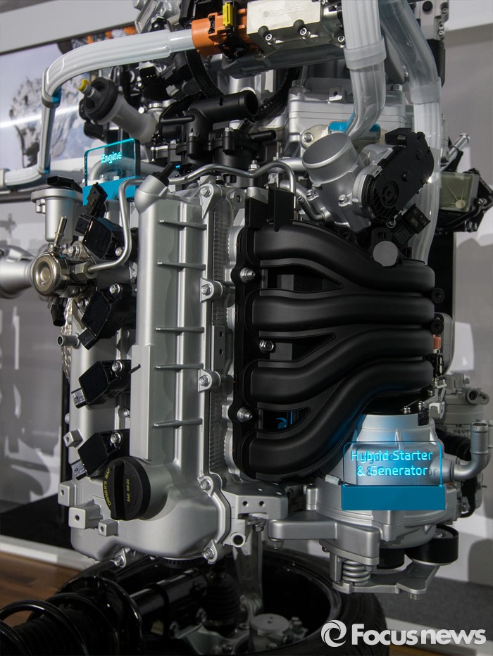 (서울=포커스뉴스) 현대자동차가 14일 오전 서울 중구 동대문디자인플라자에서 하이브리드 자동차 '아이오닉'을 선보였다. 이날 행사장에 전시된 아이오닉의 엔진과 발전기.