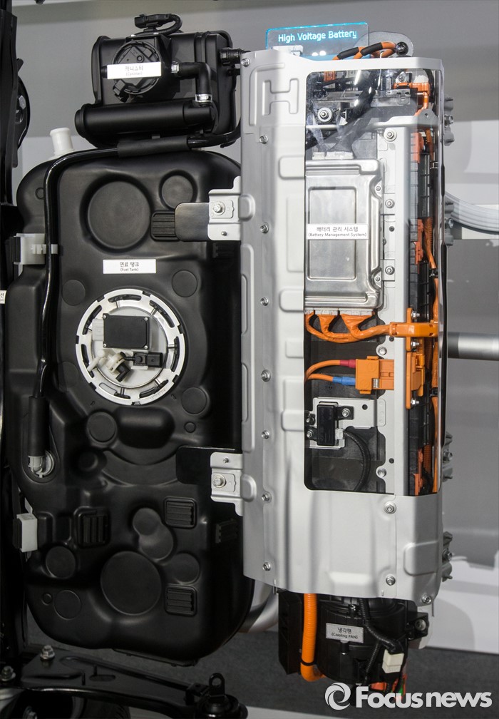 (서울=포커스뉴스) 현대자동차가 14일 오전 서울 중구 동대문디자인플라자에서 하이브리드 자동차 '아이오닉'을 선보였다. 이날 행사장에 전시된 아이오닉의 배터리.