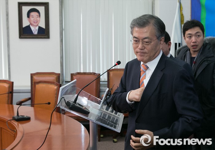 (서울=포커스뉴스) 문재인 더불어민주당 대표가 14일 오전 서울 여의도 국회에서 인재영입 기자회견을 마친 뒤 박근혜 대통령 대국민 담화 관련 취재진 질문에 답한 후 퇴장하고 있다.