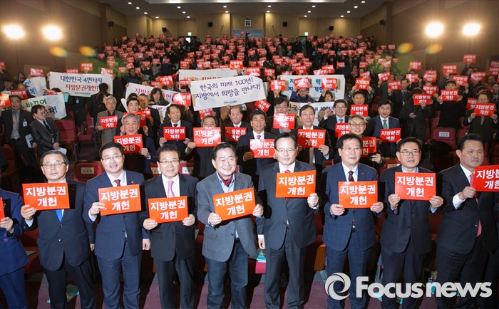 (서울=포커스뉴스) 정의화 국회의장, 조충훈 전국시장군수구청장협의회 대표회장 등이 14일 오후 서울 여의도 국회 의원회관에서 열린 지방분권 개헌 대국민 토론회에 참석해 피켓을 들고 구호를 외치고 있다.