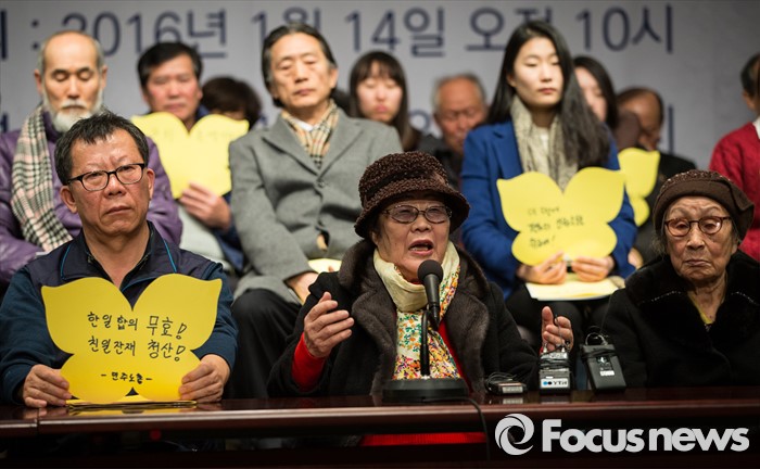 (서울=포커스뉴스) 14일 오후 서울 중구 프레스센터에서 시민사회단체와 학생, 예술 단체 등 사회각계각층이 참여하는 '한일 일본군 위안부 합의 무효와 정의로운 해결을 위한 전국행동' 발족 기자회견이 열리고 있는 가운데 이용수 할머니가 피해자 발언을 하고 있다.