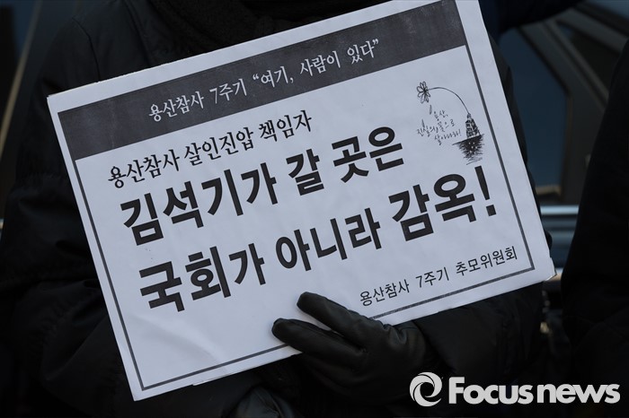 (서울=포커스뉴스) 용산참사 진상규명위원회 및 유가족들이 14일 오후 서울 영등포구 여의도 새누리당사앞에서 열린 새누리당 총선 예비후보(경주), 용산참사 책임자 김석기 규탄 기자회견을 열고 있다.