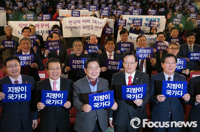 (서울=포커스뉴스) 정의화 국회의장, 조충훈 전국시장군수구청장협의회 대표회장 등이 14일 오후 서울 여의도 국회 의원회관에서 열린 지방분권 개헌 대국민 토론회에 참석해 피켓을 들고 구호를 외치고 있다.