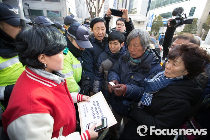 (서울=포커스뉴스) 용산참사 진상규명위원회 및 유가족들이 14일 오후 서울 영등포구 여의도 새누리당사앞에서 열린 새누리당 총선 예비후보(경주), 용산참사 책임자 김석기 규탄 기자회견이 끝나고 김석기 출당 촉구 의견서 및 항의서한을 새누리당 관계자에게 전달하고 있다.