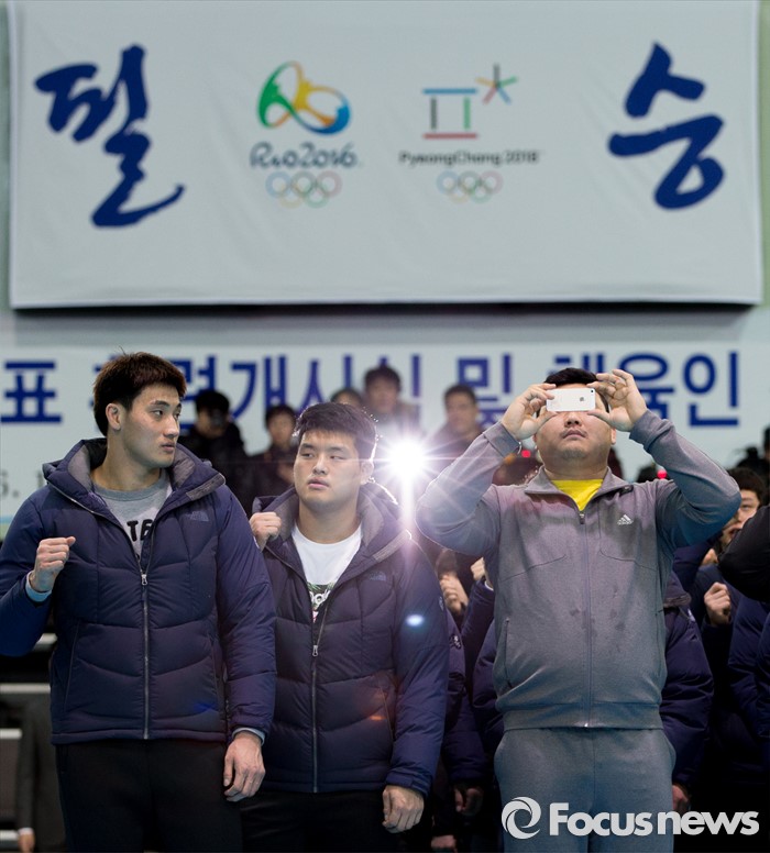 (서울=포커스뉴스) 14일 오후 서울 노원구 태릉선수촌 오륜관에서 열린 2016년 국가대표 훈련개시식 및 체육인 신년인사회에서 국가대표 선수들이 파이팅을 외치고 있다.