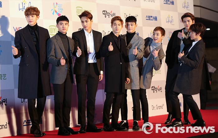 (서울=포커스뉴스) 14일 오후 서울 송파구 올림픽 체조경기장에서 열린 '25회 하이원 서울가요대상' 시상식에 참석한 아이돌 그루 엑소의 멤버들이 포토타임을 갖고 있다.
