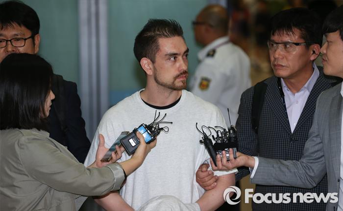패터슨은 법원에 인신보호청원과 이의신청서를 내는 등 한국 송환에 저항했지만 결국 지난해 10월 23일 국내로 송환돼 현재 서울구치소에 수감돼 있다.(인천=포커스뉴스) '이태원 살인 사건'의 진범으로 지목된 미국인 아더 존 패터슨이 23일 오전 인천 중구 공항로 인천국제공항을 통해 국내로 송환돼 기자의 질문을 듣고 있다. 2015.09.23 오장환 기자