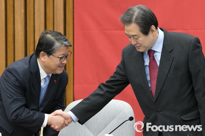 (서울=포커스뉴스) 김무성(오른쪽) 새누리당 대표와 조원진 원내수석부대표가 15일 오전 서울 여의도 국회에서 열린 주요당직자회의에 참석해 악수하고 있다.
