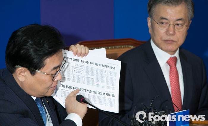 (서울=포커스뉴스) 전병헌 더불어민주당 최고위원이 15일 오전 서울 여의도 국회에서 열린 최고위원회의에 참석해 당 인재영입 관련 언론보도를 들고 발언하고 있다. 오른쪽은 문재인 대표.