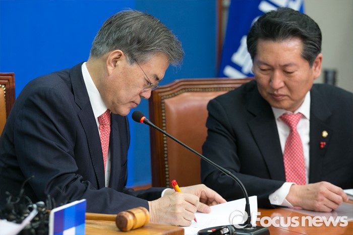 (서울=포커스뉴스) 문재인(왼쪽) 더불어민주당 대표와 정청래 최고위원이 15일 오전 서울 여의도 국회에서 열린 최고위원회의에 참석해 대화하고 있다.