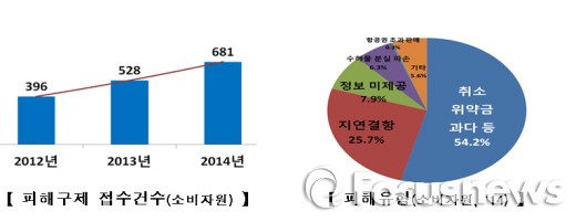 한국소비자원에 따르면 항공 피해상담 건수는 2010년 1597건에서 2012년 2931건, 2014년6789건으로 급격하게 늘어나고 있다.