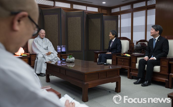 (서울=포커스뉴스) '국민의당' 안철수 의원과 한상진 창당준비위원장이 15일 오전 서울 종로구 조계사에서 자승 총무원장과 새해 인사를 나누고 있다.