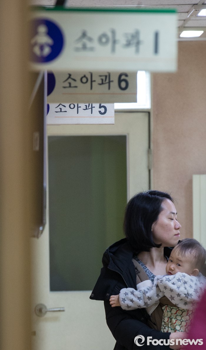 (서울=포커스뉴스) 인플루엔자 유행주의보가 발령된 15일 오전 서울 용산구 소화아동병원에서 한 엄마가 자녀와 진료 차례를 기다리고 있다.