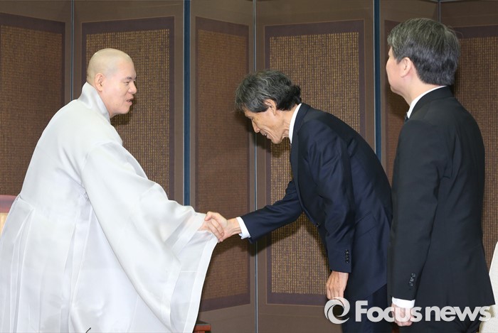 (서울=포커스뉴스)15일 오전 한상진 국민의당 창당준비위원장이 안철수의원(오른쪽)과 함께 조계사를 방문해 자승 총무원장을 만나 인사를 나누고 있다.