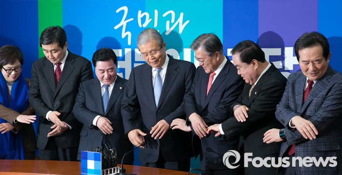 (서울=포커스뉴스) 더불어민주당 조기선대위원장으로 영입된 김종인 전 새누리당 국민행복추진위원장이 15일 오전 서울 여의도 국회에서 기자간담회에 앞서 의원들과 함께 손을 잡고 있다. 왼쪽부터 이미경 의원, 이종걸 원내대표, 이석현 국회 부의장, 김 위원장, 문재인 대표, 문희상, 정세균 의원.