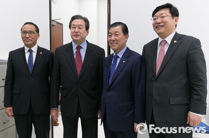 (서울=포커스뉴스) 김무성(왼쪽 두번째) 새누리당 대표와 황진하(오른쪽 두번째) 사무총장이 15일 오전 서울 여의도 국회에서 취임 인사 차 방문한 주형환(오른쪽 첫번째) 산업통상자원부 장관, 홍윤식 행정자치부 장관과 기념촬영을 하고 있다.