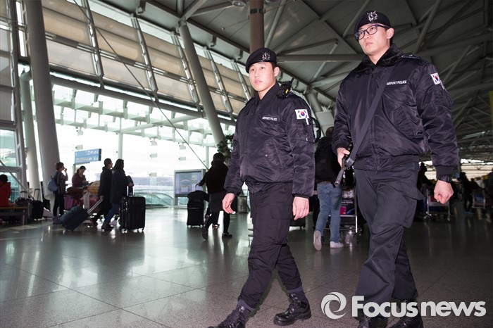 (인천공항=포커스뉴스) 한국공항공사 콜센터로 '전국공항'에 폭발물을 설치 했다는 협박 전화가 걸려온 15일 오후 인천국제공항 출국장에서 경찰특공대원들이 경계근무를 서고 있다.