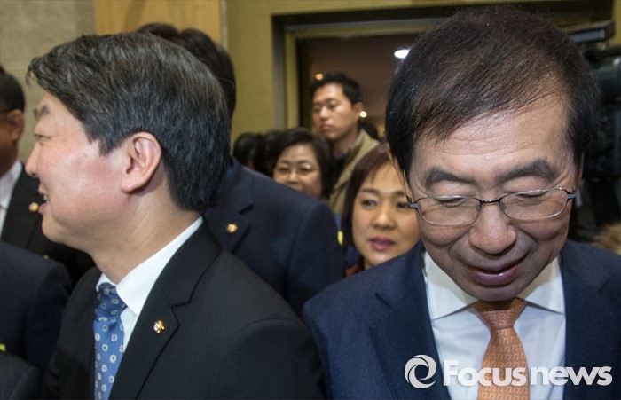 (서울=포커스뉴스) 15일 오후 서울 노원구청 대강당에서 열린 2016 노원구 신년인사회에 참석한 안철수(왼쪽) 국민의당 인재영입위원장과박원순 서울시장이 식장으로 발걸음을 옮기고 있다.