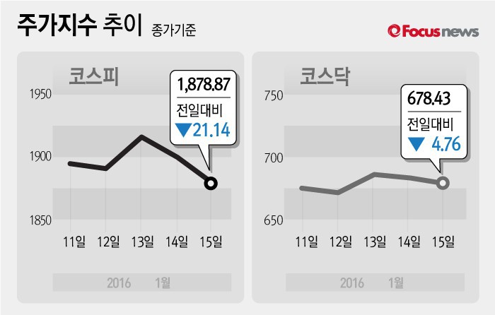 (서울=포커스뉴스) 15일 코스피지수는 전날 보다 1.11%(21.14포인트) 내린 1878.87에 장을 마쳤다. 코스닥지수는 전일 대비 0.70%(4.76포인트) 내린 678.43에 마감했다.