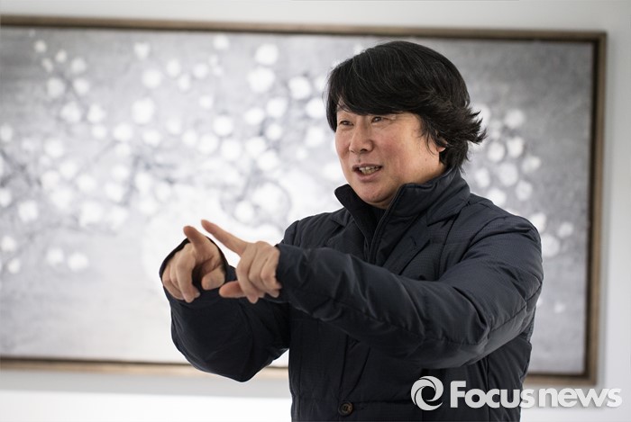 (서울=포커스뉴스) 15일 오후 서울 용산구 갤러리 조은에서 김덕용, 전병현 작가의 '갤러리 조은 개관전'이 열리고 있는 가운데 전병현 작가가 취재진에게 작품 설명을 하고 있다.