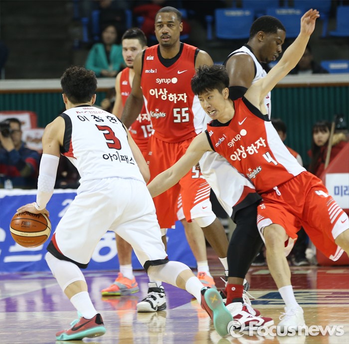 (서울=포커스뉴스) 15일 서울 잠실학생체육관에서 열린 2015-2016 프로농구 SK-KGC 경기에서 SK 박형철이 KGC 이정현의 드리블을 저지하고 있다.