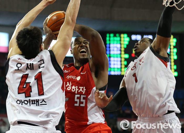 (서울=포커스뉴스) 15일 서울 잠실학생체육관에서 열린 2015-2016 프로농구 SK-KGC 경기에서 SK 사이먼이 KGC 오세근과 찰스 로드 사이로 슈팅을 시도하고 있다.