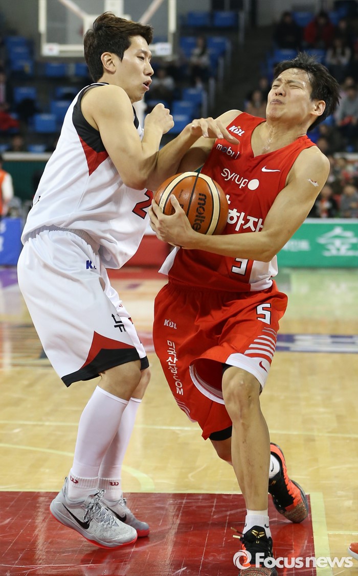 (서울=포커스뉴스) 15일 서울 잠실학생체육관에서 열린 2015-2016 프로농구 SK-KGC 경기에서 KGC 김기윤이 SK 김선형의 돌파를 저지하고 있다.