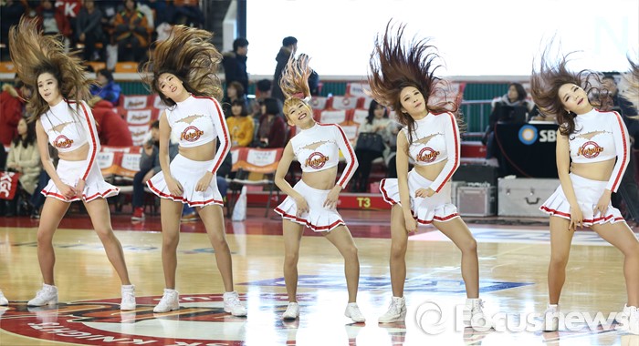(서울=포커스뉴스) 15일 서울 잠실학생체육관에서 열린 2015-2016 프로농구 SK-KGC 경기에서 SK 치어리더가 경기 시작전 코트의 분위기를 끌어 올리는 발랄한 춤을 선보이고 있다.