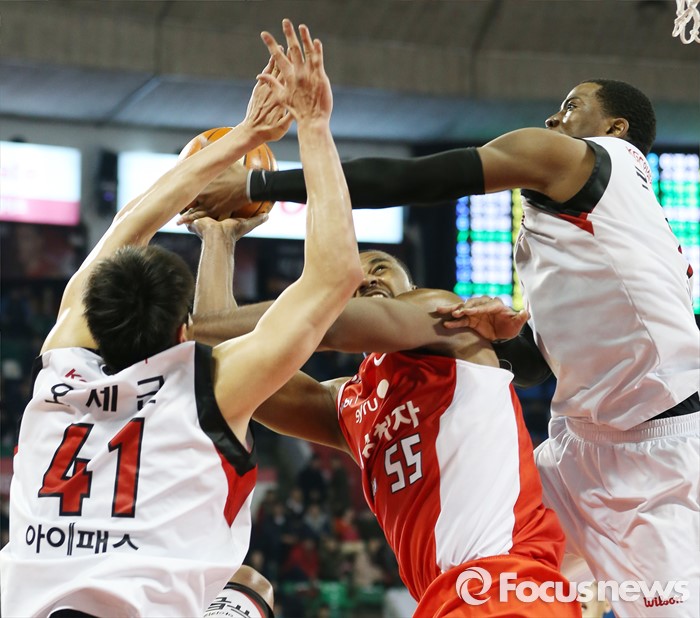 (서울=포커스뉴스) 15일 서울 잠실학생체육관에서 열린 2015-2016 프로농구 SK-KGC 경기에서 SK 사이먼의 슈팅을 KGC 찰스 로드와 오세근이 앞 뒤에서 막고 있다.