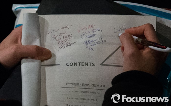 (서울=포커스뉴스) 16일 오후 서울 강남구 숙명여고 대강당에서 열린 '대성학원 재수성공전략 설명회'에서 한 학부모가 성공전략을 메모하고 있다.