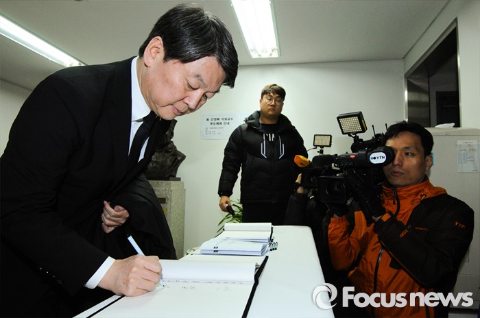 (서울=포커스뉴스) 안철수 국민의당 인재영입위원장이 16일 오후 서울 구로구 성공회대학교 성미가엘성당에 마련된 故 신영복 성공회대 석좌교수의 빈소에 들어서기 전 방명록을 쓰고 있다. <사진제공=성공회대학교>