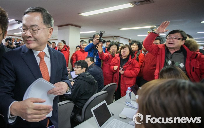 (서울=포커스뉴스) 안대희 전 대법관이 17일 서울 여의도 새누리당사에서 열린 기자회견에서 제 20대 총선 마포갑 출마를 공식 선언을 하자 강승규 마포갑 당협위원장을 비롯한 지지자들이 거세게 항의하고 있다.
