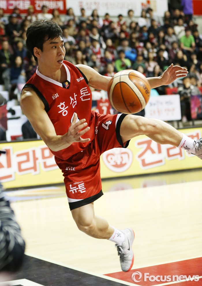 (안양=포커스뉴스) 17일 안양실내체육관에서 열린 2015-2016 프로농구 KGC-모비스 경기에서 KGC 김윤태가 몸에 맞고 아웃되는 볼을 살려내고 있다.