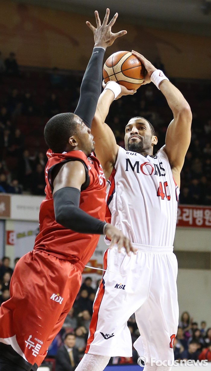 (안양=포커스뉴스) 17일 안양실내체육관에서 열린 2015-2016 프로농구 KGC-모비스 경기에서 KGC 찰스 로드가 모비스 클라크의 슈팅에 블록을 시도하고 있다.