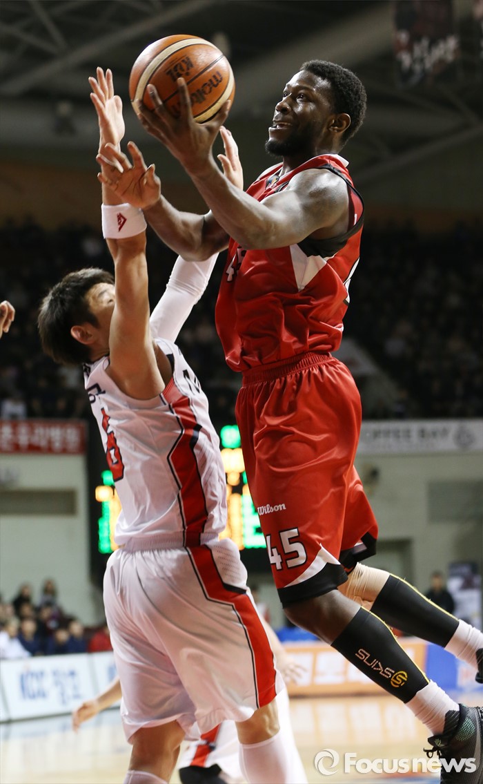 (안양=포커스뉴스) 17일 안양실내체육관에서 열린 2015-2016 프로농구 KGC-모비스 경기에서 KGC 마리오 리틀이 모비스 양동근의 마크를 피하며 레이업슛을 시도하고 있다.