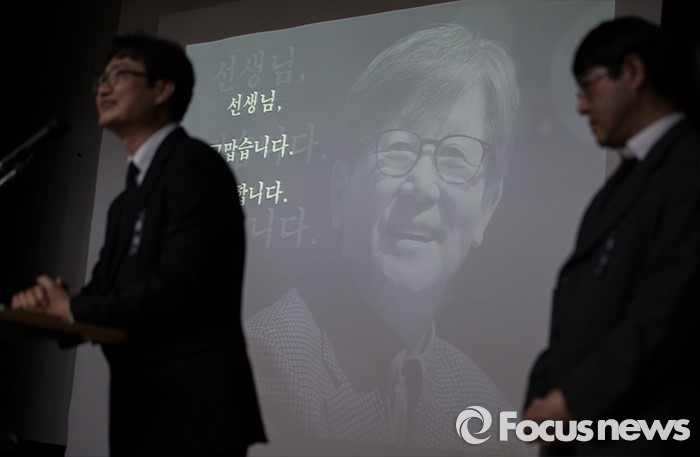 (서울=포커스뉴스) 17일 밤 서울 구로구 성공회대학교에서 열린 '신영복 교수 추모의 밤' 행사에서 '더불어 숲' 관계자가 추모사를 하고 있다.