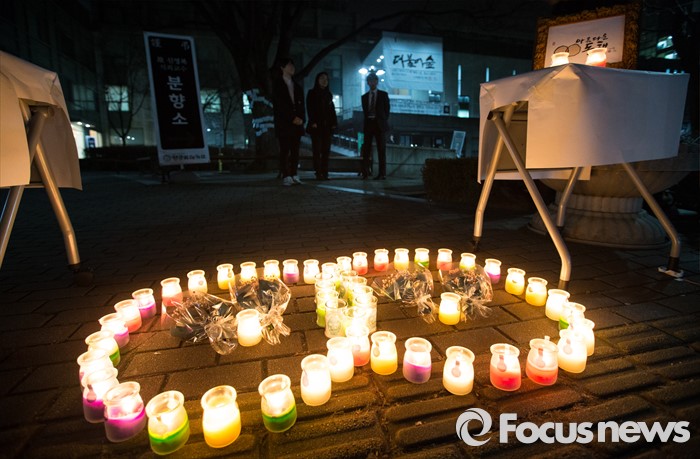 (서울=포커스뉴스) 17일 밤 서울 구로구 성공회대학교 대학성당 앞에 마련된 故 신영복 석좌교수의 빈소 앞에 신영복 교수의 명복을 기원하는 촛불이 놓여져 있다.