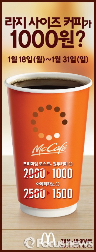 (서울=포커스뉴스) 맥도날드는 오는 31일까지 2주 동안 맥카페(McCafé)의 메뉴인 프리미엄 로스트 원두커피와 아메리카노 라지 사이즈를 기존 가격에서 1000원 할인하는 특별 행사를 진행한다.