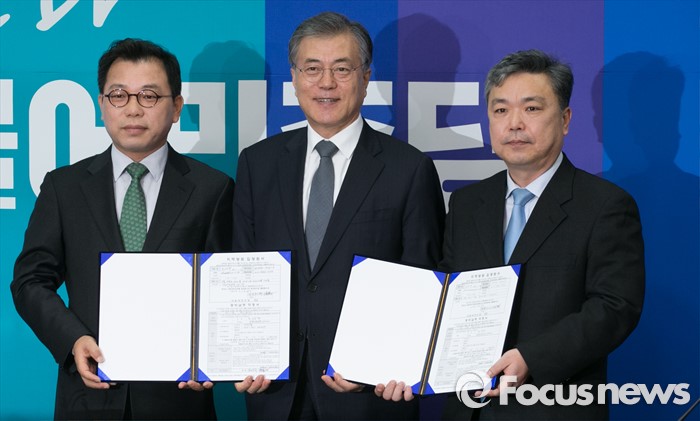 (서울=포커스뉴스) 문재인(가운데) 더불어민주당 대표가 18일 오전 서울 여의도 국회에서 오성규(왼쪽) 전 서울시설관리공단 이사장과 김민영 전 참여연대 사무처장 인재영입 기자회견에 참석해 입당원서를 들고 포즈를 취하고 있다.