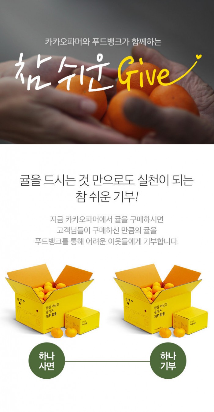 소비자가 감귤 한박스를 구입하면, 제주광역 푸드뱅크를 통해 어려운 이웃들에게 감귤 한박스가 기부된다.