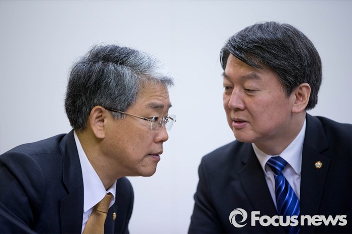 (서울=포커스뉴스)국민의당(가칭) 안철수 인재영입위원장이 18일 오전 서울 마포구 국민의당 당사에서 열린 기조회의에 참석 김동철 부위원장에게 귀엣말을 하고 있다.