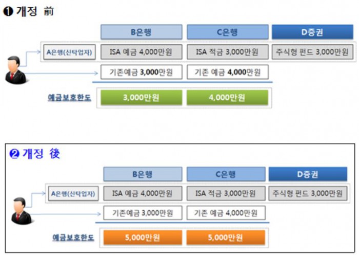 이에따라 신탁형 ISA에 A은행 적금 3000만원, B은행 예금 4000만원을 담을 경우 각 은행별로 5000만원의 예금자보호법 적용을 받는다.