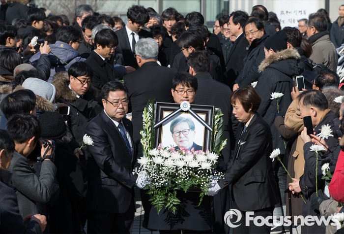 (서울=포커스뉴스) 18일 오후 서울 구로구 성공회대학교에서 엄수된 '故 신영복 석좌교수 영결식'에서 고인의 영정과 유해가 운구되고 있다.