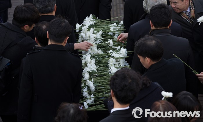 (서울=포커스뉴스) 18일 오후 서울 구로구 성공회대학교에서 엄수된 '故 신영복 석좌교수 영결식'에서 고인의 영정과 유해가 운구되고 있다.