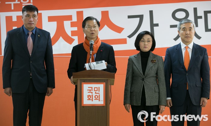 (서울=포커스뉴스) 천정배 국민회의 창당준비위원장이 18일 오후 서울 여의도 당사에서 열린 인재입당식에 참석해 인사말을 하고 있다. 왼쪽부터 김영수 전 해군소령, 천 위원장, 장정숙 전 서울시의원, 채수창 전 화순경찰서장.