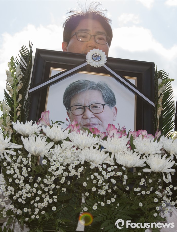 (서울=포커스뉴스) 18일 오후 서울 구로구 성공회대학교에서 엄수된 '故 신영복 석좌교수 영결식'에서 고인의 영정과 유해가 운구되고 있다.