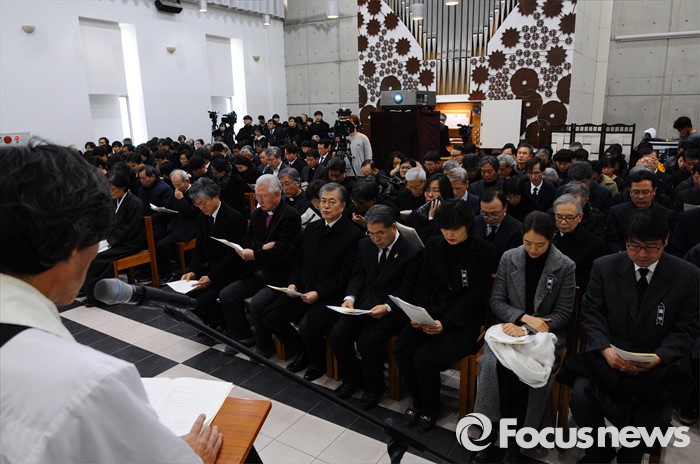 (서울=포커스뉴스) 18일 오후 서울 구로구 성공회대학교 대학성당에서 열린 故 신영복 석좌교수 영결식에서 문재인 더불어민두장 대표와 이재정 경기도교육감 등 참석자들이 고별 예식을 하고 있다. <사진제공=성공회대>