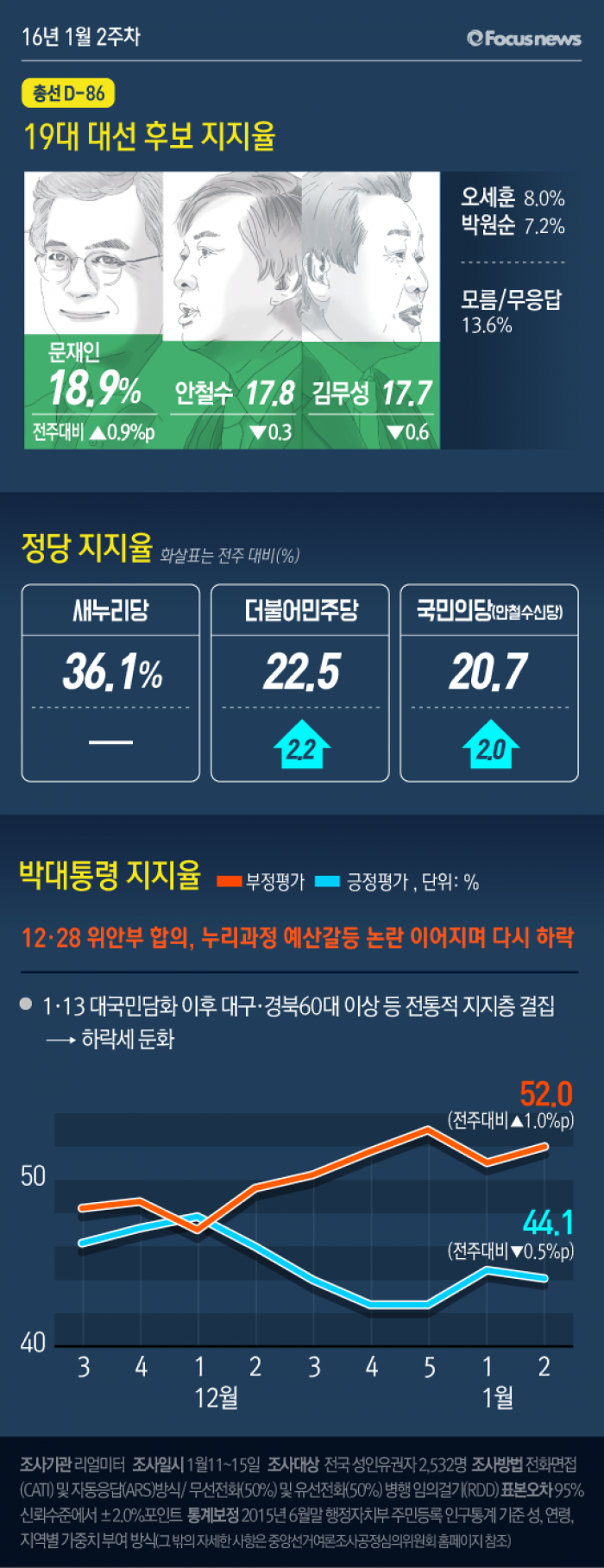 총선을 앞두고 주요 정당대표가 영입 경쟁에 몰두하고 있는 가운데 문재인 더불어민주당 대표의 지지도가 소폭 상승했습니다. 반면 국민의당 창당을 추진 중인 안철수 무소속 의원과 김무성 새누리당 대표는 떨어졌습니다.